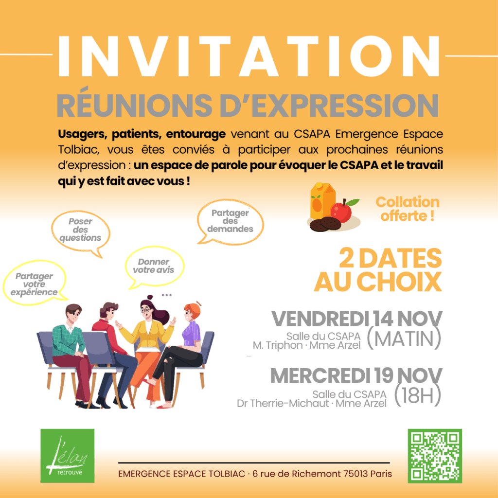 Usagers, patients, proches… Vous fréquentez le CSAPA Emergence Espace Tolbiac ? Nous vous invitons à participer à nos réunions d’expression !